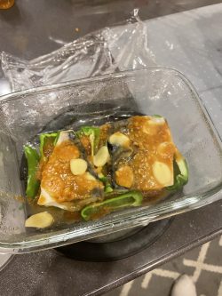 さば!スライスした生姜、味噌ダレを