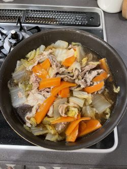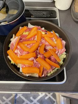 鍋にいれて白菜、にんじん、豚肉を
