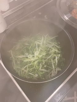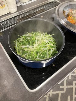 豆苗ともやしをお鍋にいれ