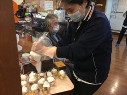 3月のおやつ作りはカステラの上に生クリームをのせてみかんとコアラのマーチが登場
