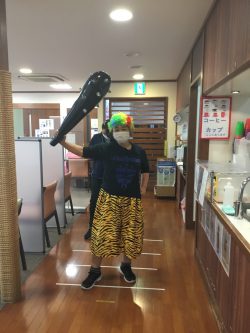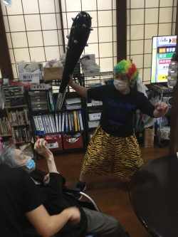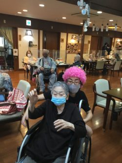 ピンクカツラのくっきり眉毛で登場したスッタフ0!利用者さんとツーショット!