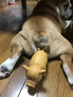 スタッフSさんのお友達のわんこ、ブルドッグのトリスくん。ぶたのおもちゃがお気に入りのようですが・・・