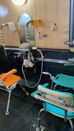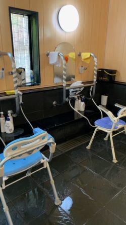 また、カラフルな介助椅子に座っていただいての洗い場となっています。