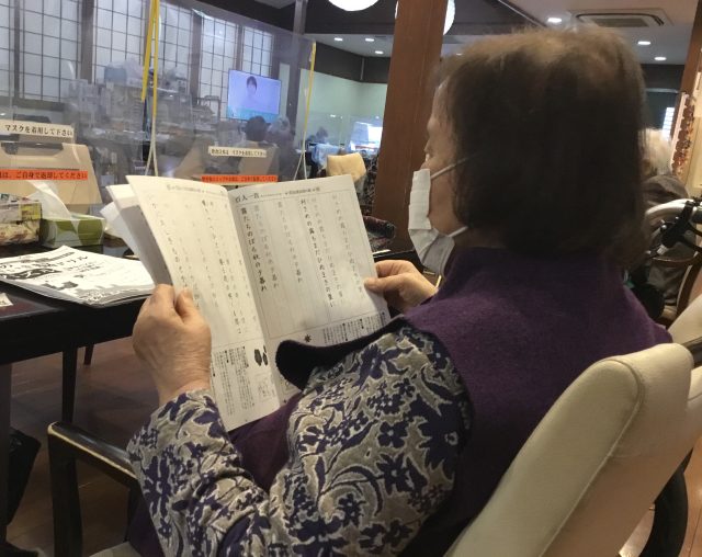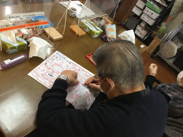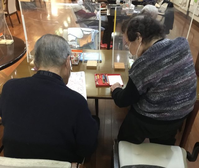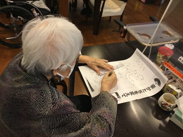 真剣にプリントを見つめるI様は脳トレプリントを確認中。