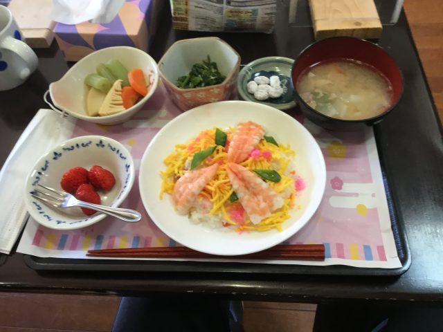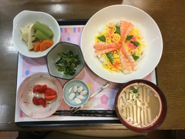 お昼のお食事はひな祭り膳としてちらし寿司、筍とふきの炊き合わせ