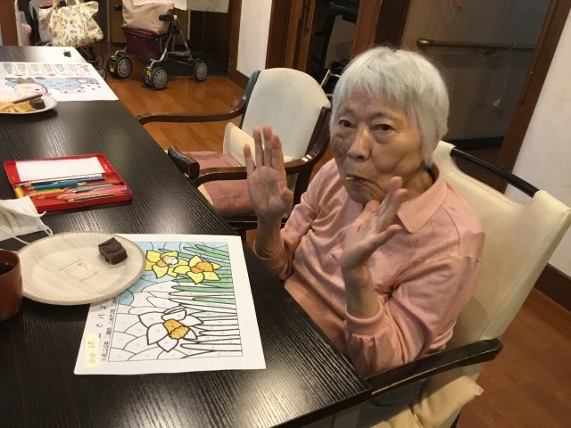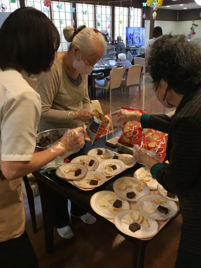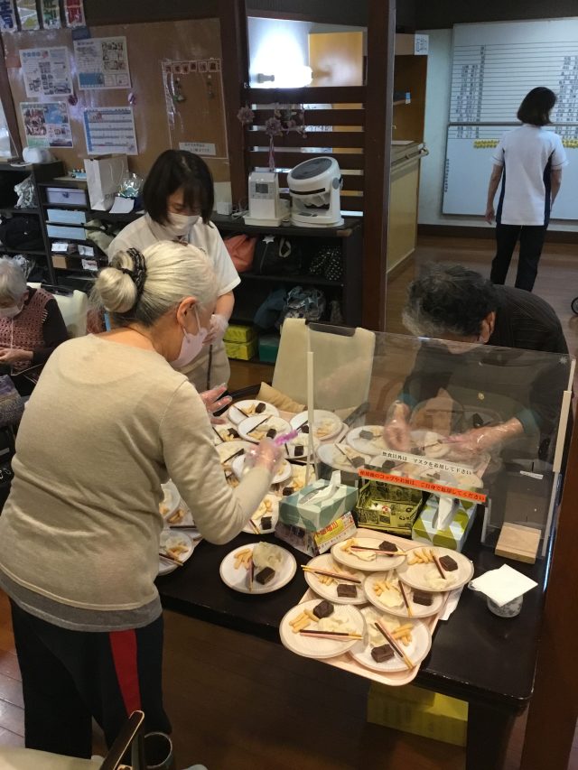 いつも饒舌なツッコミもまろやかに受け答えされる利用者N様💕チョコレートをパクッ!