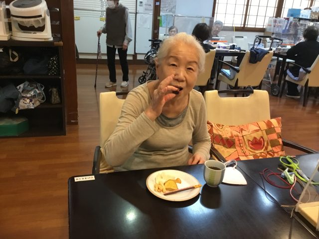 いつも笑顔が絶えない利用者N様💕ポッキーをお口にハイ!ポーズ🙌