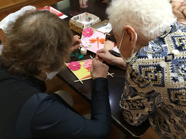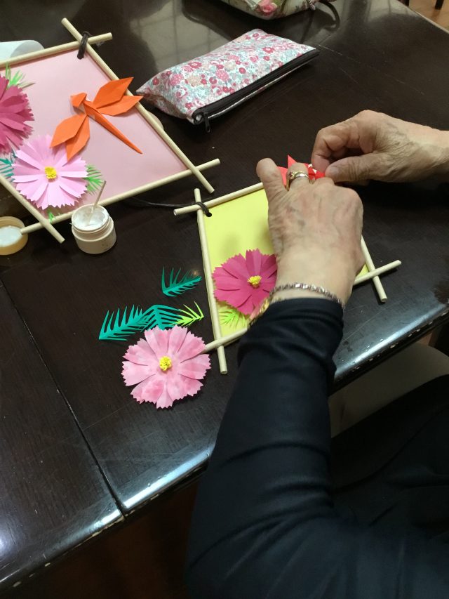 折り紙で作った秋桜とトンボを紙ストローのフレームに貼り付け