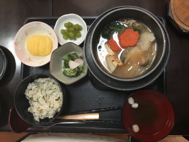 昼食は行事食で、味噌ちゃんこ鍋です。 ご飯は菜飯、胡瓜の酢の物、
