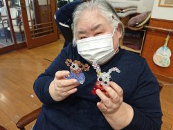 自宅で作られたビーズのお人形を持って