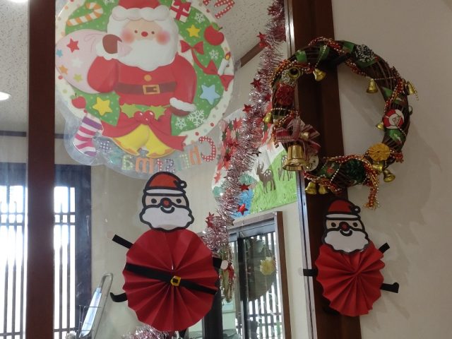 大勢のサンタさんに囲まれての 血圧測定です(笑) 徐々に利用者の皆様が到着されて クリスマスムードで盛り上がってきました B様はマフラーにクリスマスリースの ブローチをつけて来られました 以前デイサービス伊賀で作った作品です