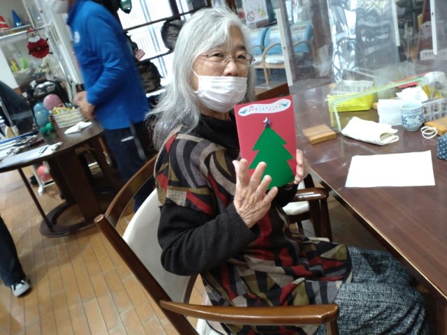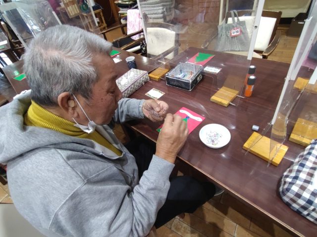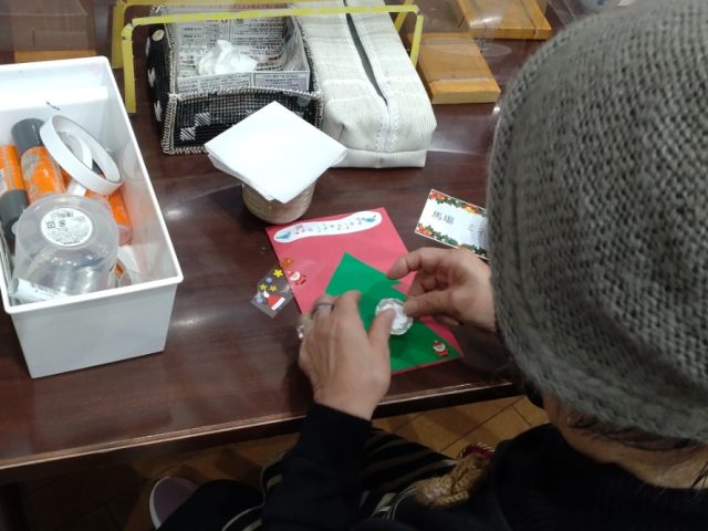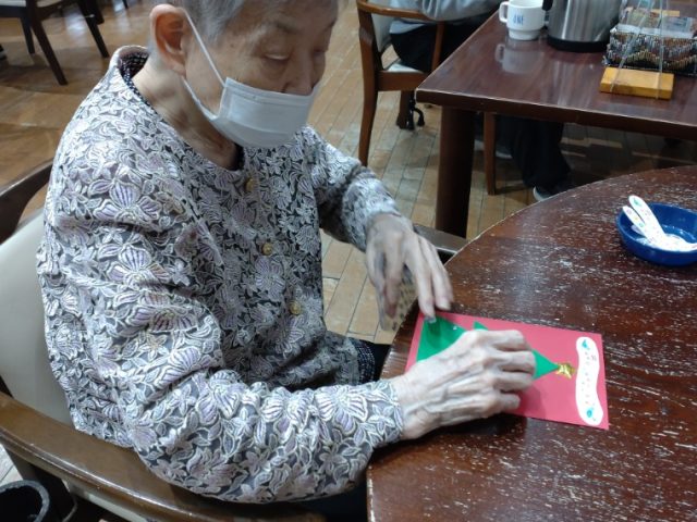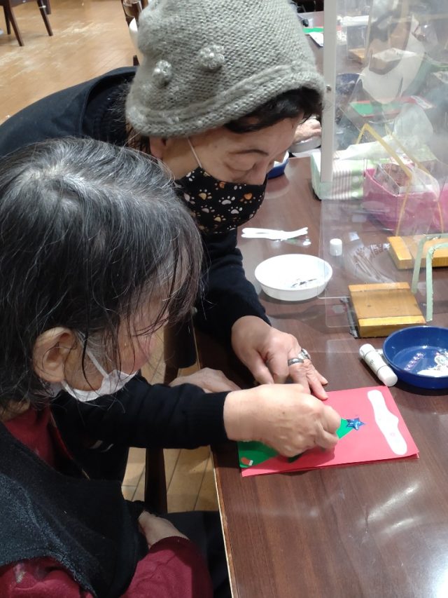 午後からは ・クリスマスソングの合唱会 ボランティアによる ・ヘルマンハープ演奏 『クリスマスコンサート』 が開催されます 歌詞カードは皆さまが ご自身で飾りつけをされました 皆様熱心に作成中K様 真剣です