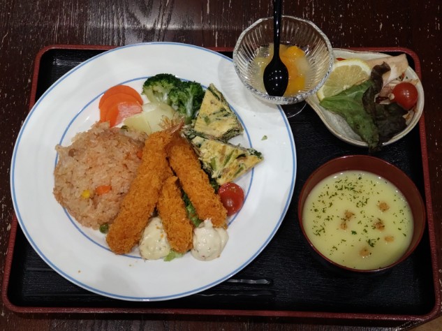 ランチプレートはこんな感じチキンライス 海老フライ キッシュ ポタージュスープ チキン デザート