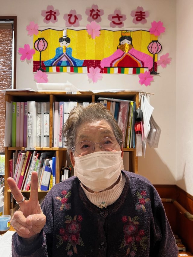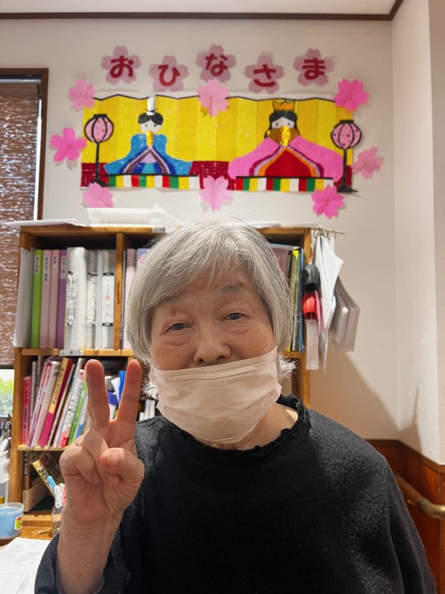 ひな祭り当日は本当のひな人形、そしてバックには桃の花、菜の花が