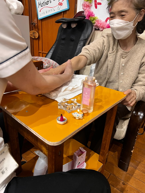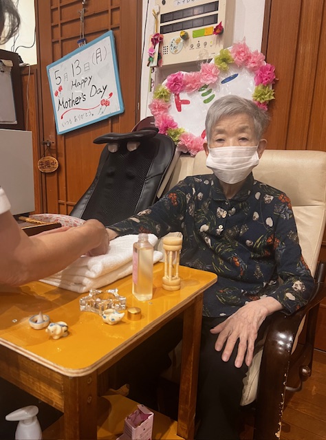 ここデイサービス伊賀では、職員Tによるハンドマッサージで