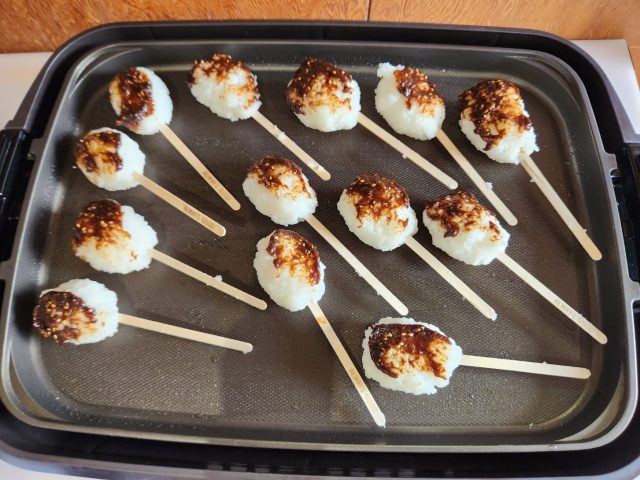 さぁ、焼き上がったら味噌だれを塗って五平餅の完成!