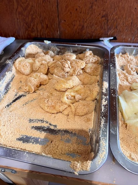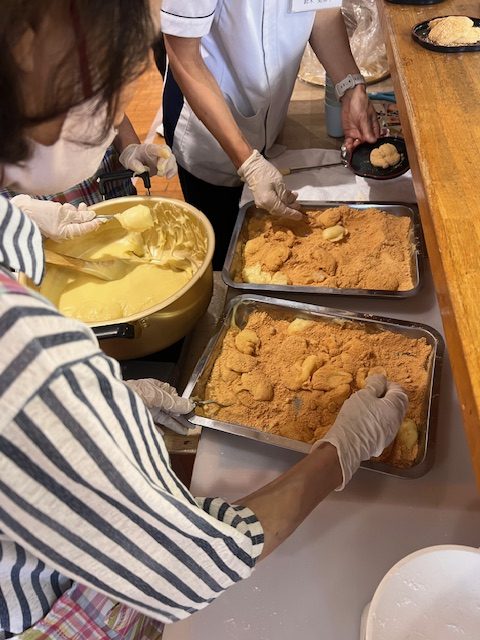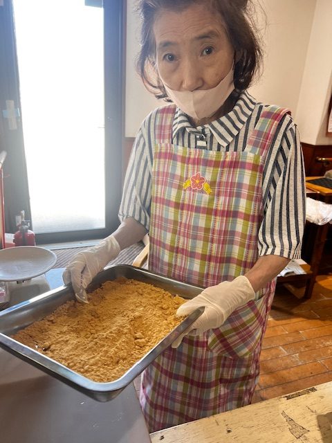 バットにきな粉とお砂糖を広げて、固まってきたら、まぶしていきます!