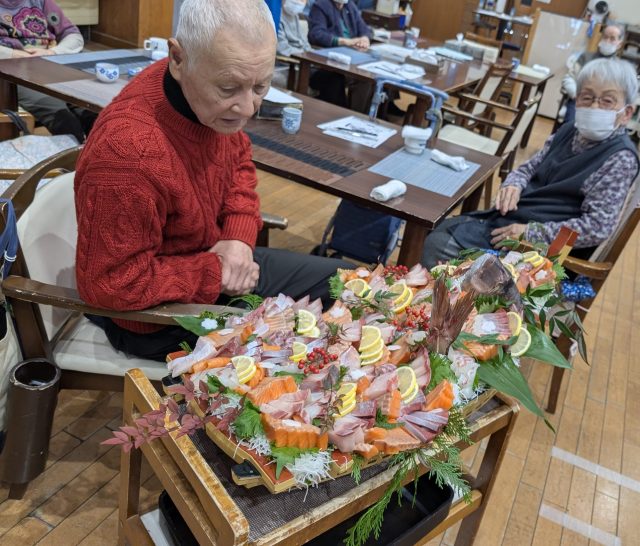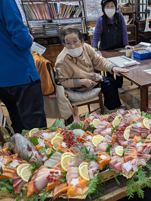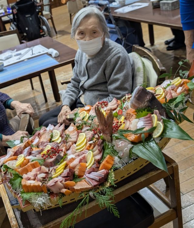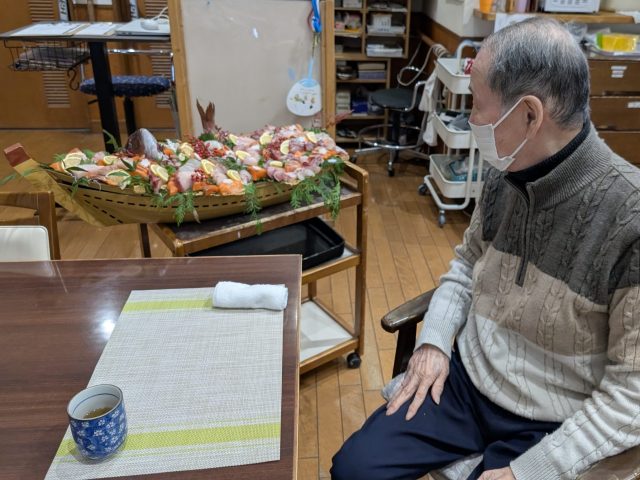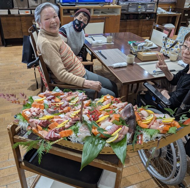 デイサービスにお魚を捌けるスタッフに来てもらい、昼食時に立派な舟盛りをご提供します✨