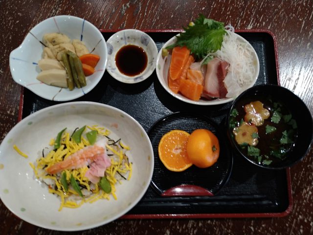 ちらし寿司・小鉢・赤だし・みかんの〖舟盛り祝い膳〗