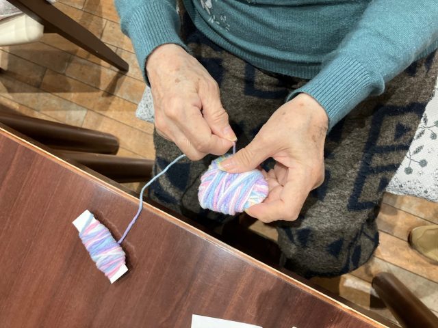 ひたすらハート型の厚紙に可愛い毛糸を巻いていきます。