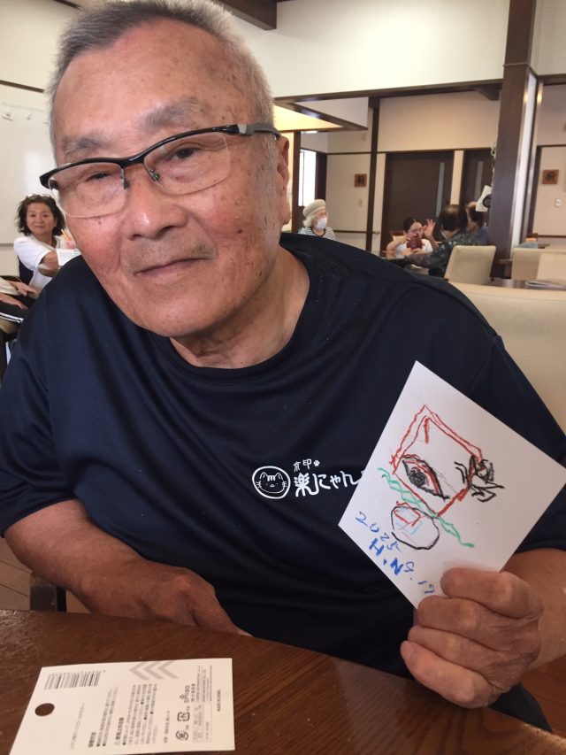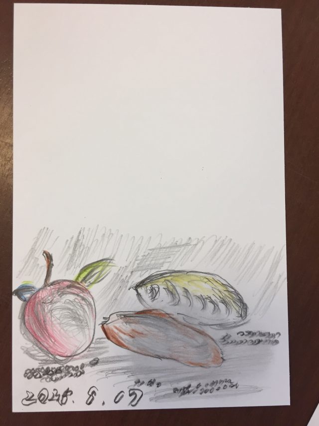 前回の作品は(写真はないのですが、ご本人曰く、捨てようと思って持って帰ったと)黒田征太郎も顔負けのいい絵でした。