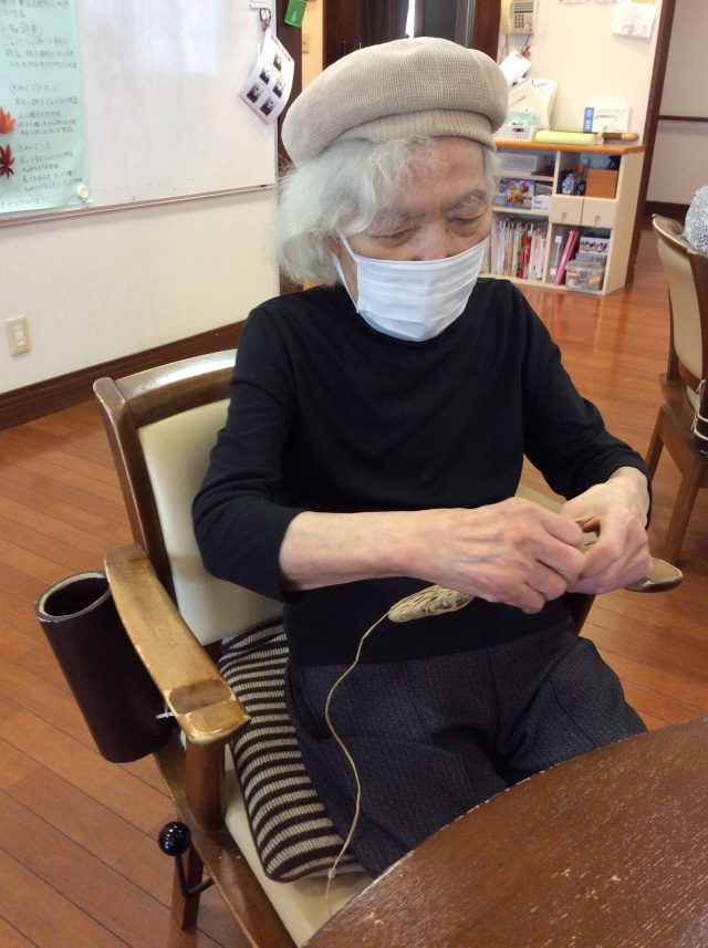 とても一生懸命に紙ひもを巻いて