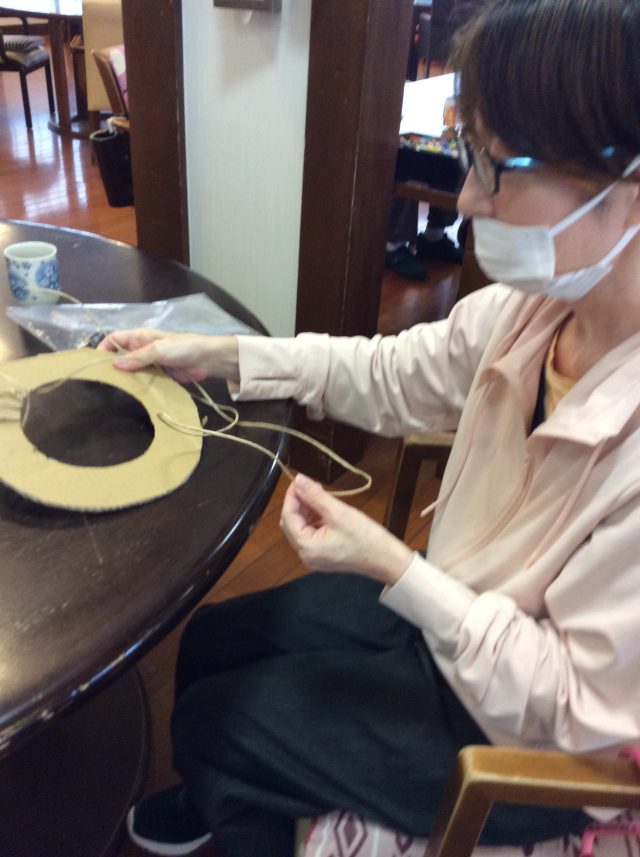 輪っかに紙ひもを巻いておられる