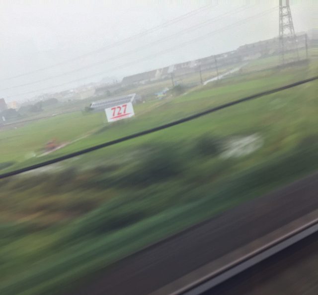 ありました、一瞬ですが、田んぼに立つ看板。これが、村上隆の727に