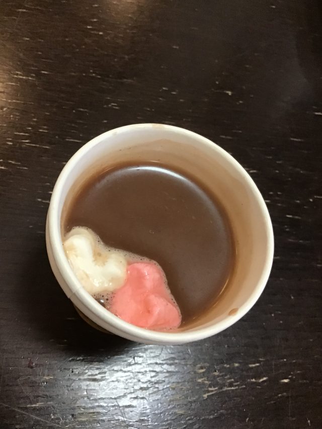 ココアの中に、何か紅白のハートの物体が❓