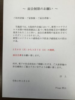 緊急事態宣言の期間が延長されたことに伴い、面会自粛期間の延長を