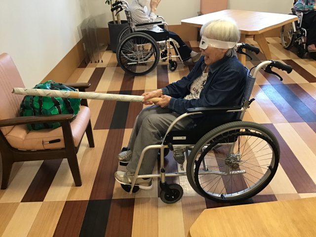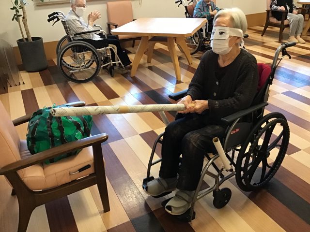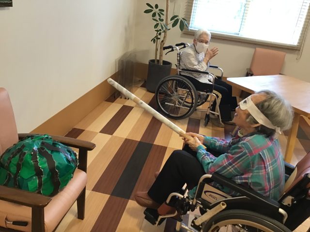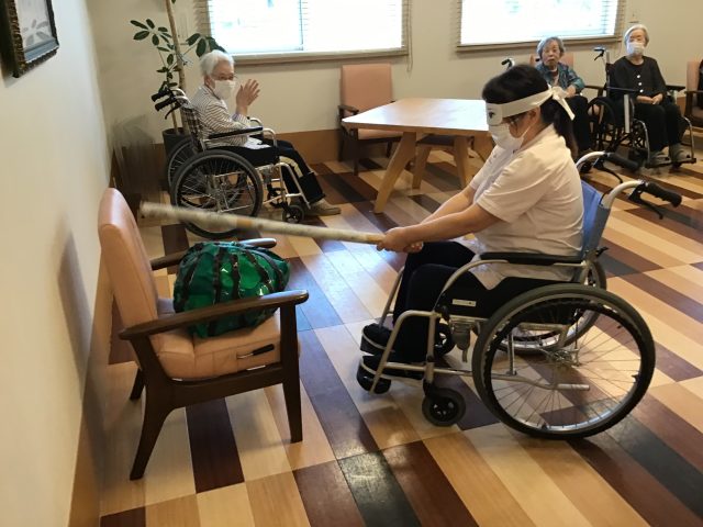 今月はスイカ割りをして遊びました。と、言っても手作りの🍉スイカです(^-^;