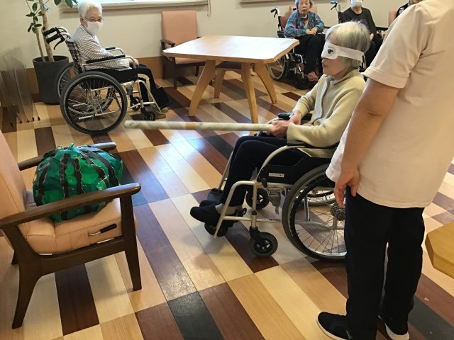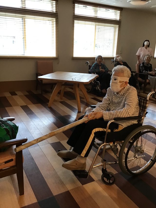 みなさんに車椅子に座って頂き、目隠しで自走し頑張りました(^^)/