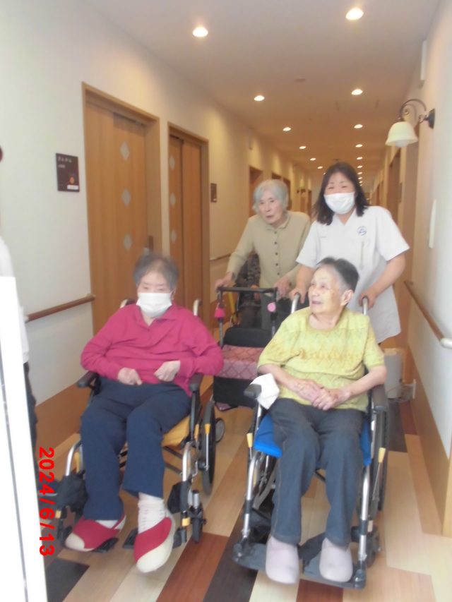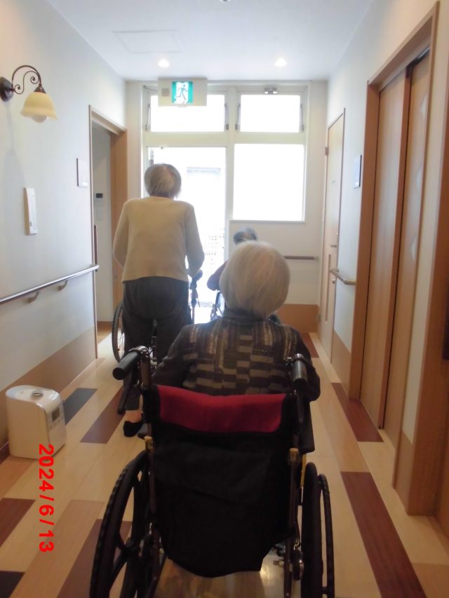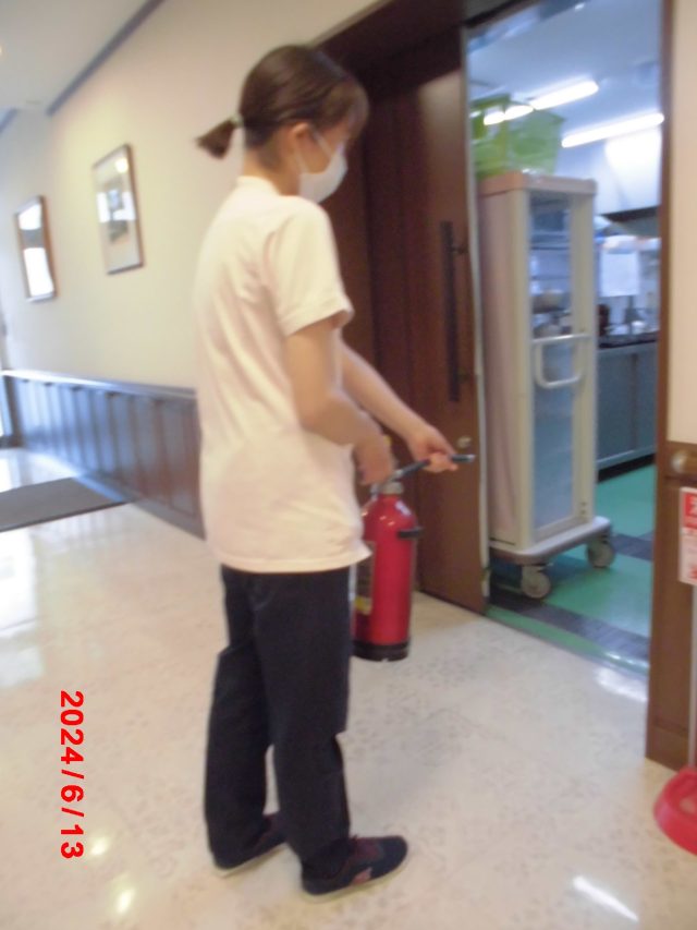 ご利用者様にも参加して頂き非常口まで誘導しています。