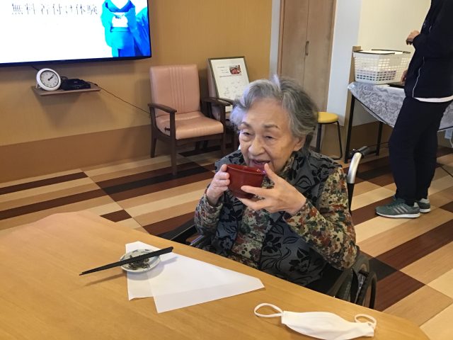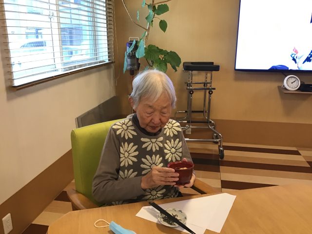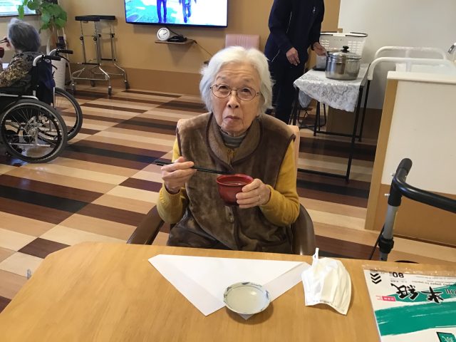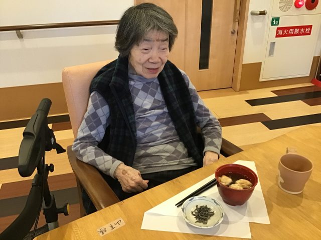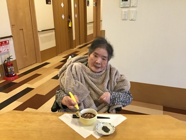 今日は、″鏡開き″で皆様にお餅の代わりに餅麩の入ったお善哉を食べて頂きました。