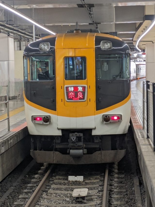 近鉄の特急は様々な形態があることで有名ですが、この日は12時10分発の橿原神宮前行の特急に乗車。12時発の奈良行でも行けるんですけど、写真の通り橿原神宮行はAce車両、奈良行は年季の入ったサニーカーということで、橿原神宮前行に乗車しました。