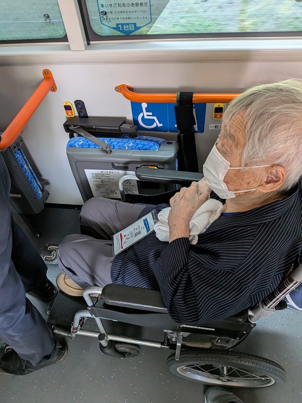 舞洲からの万博P&Rバスについては、車いすでも乗車ができるので、利用者様も上機嫌でバスに乗車。ほどなく万博西ゲートへ到着しました。