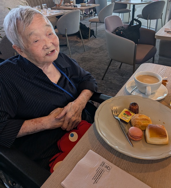万博会場への到着がお昼前だったので、おなかがすいていたご様子で、お食事をお召し上がりになられていました。お食事後はデザートとコーヒーでリラックスタイム。