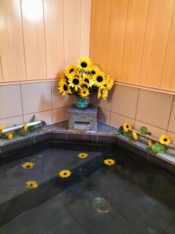 今週は期間限定で、浴室をひまわりで飾ってみたり、いつもと違う種類のシャンプーを何種類かご用意させて頂きました♨