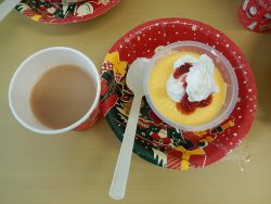 クリスマスには少し早いですが、今日のおやつの時間に利用者様にプリンアラモードと温かい紅茶を提供させて頂きました。皆様、美味しいと笑顔で仰って下さいました。
