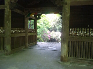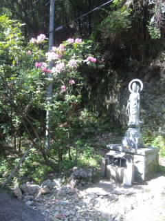 山門前の お迎え 観音様と 満開の シャクナゲ