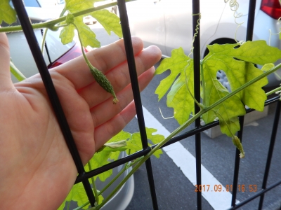 事務所の横にある花壇で小さくこっそり育っているゴーヤを見つけました