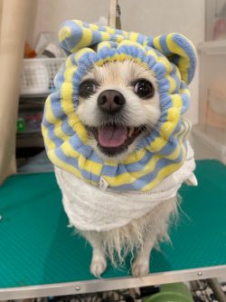 シャンプーあとの写真、お店の方が撮ってくれました。大嫌いなトリミングですが