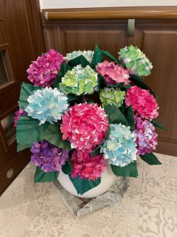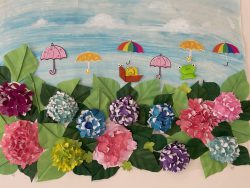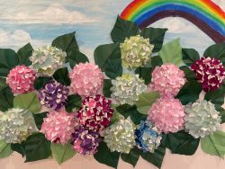 大作で模造紙に絵を描いて梅雨のあじさいが咲きました。