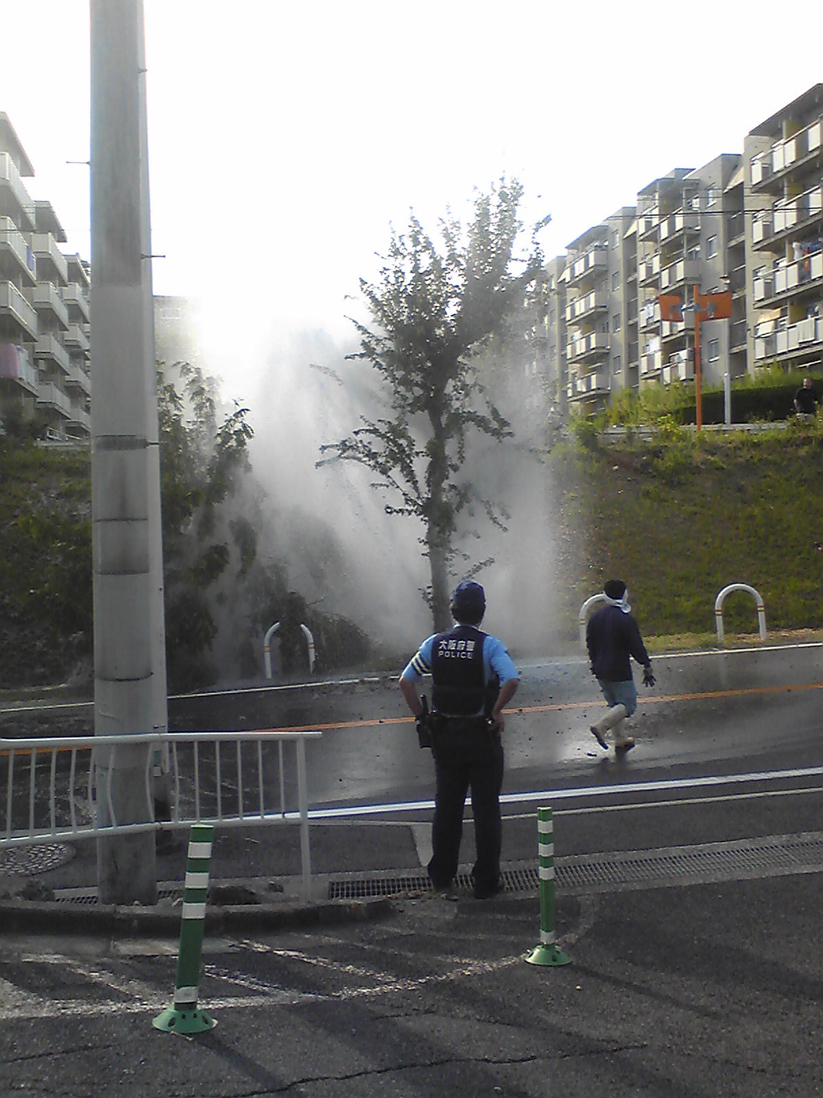 水の勢いは凄くて 大きな石がごろごろ 地下からアスファルトの上に・・・